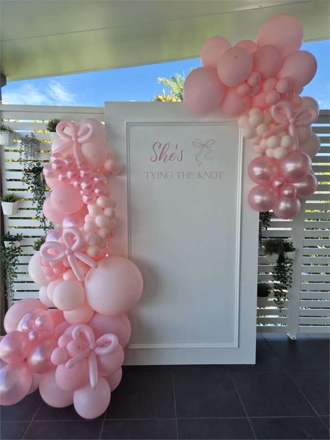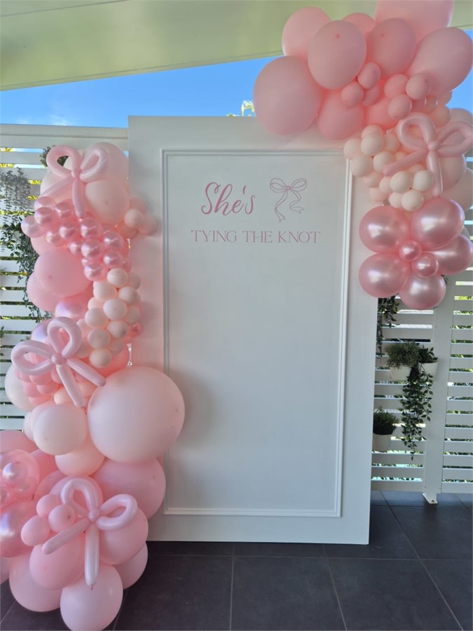 Elevate your ceremony or reception with the Frame Backdrop This premium backdrop package combines a custom single board, a 3m balloon garland, and a custom decal.