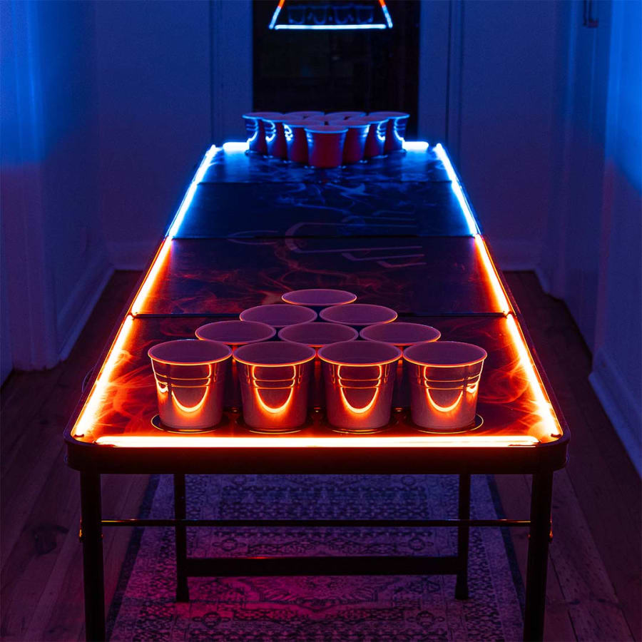 Our unique folding Light Up Beer Pong Table is unique to In Any Event and is the perfect solution to your party needs. The Beer Pong Table measures the official competition size of 8ft when set up.