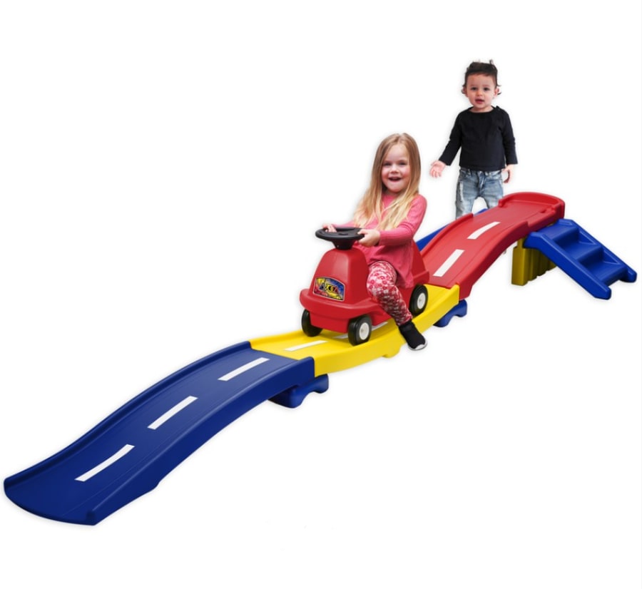 Have your children experience the thrills of a roller coaster in the comfort of their own home with this colourful Avoca ride and glide roller coaster. The roller coaster comes with almost approx. 3.15m of wavey track, that thrill seekers will enjoy. Once they glide off, they can push the car back up and go again! The car comes with a high back seat and foot rests for comfortable riding, with a non-functional steering wheel.