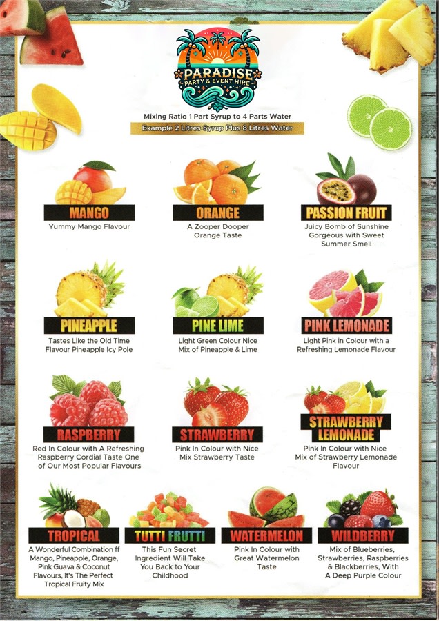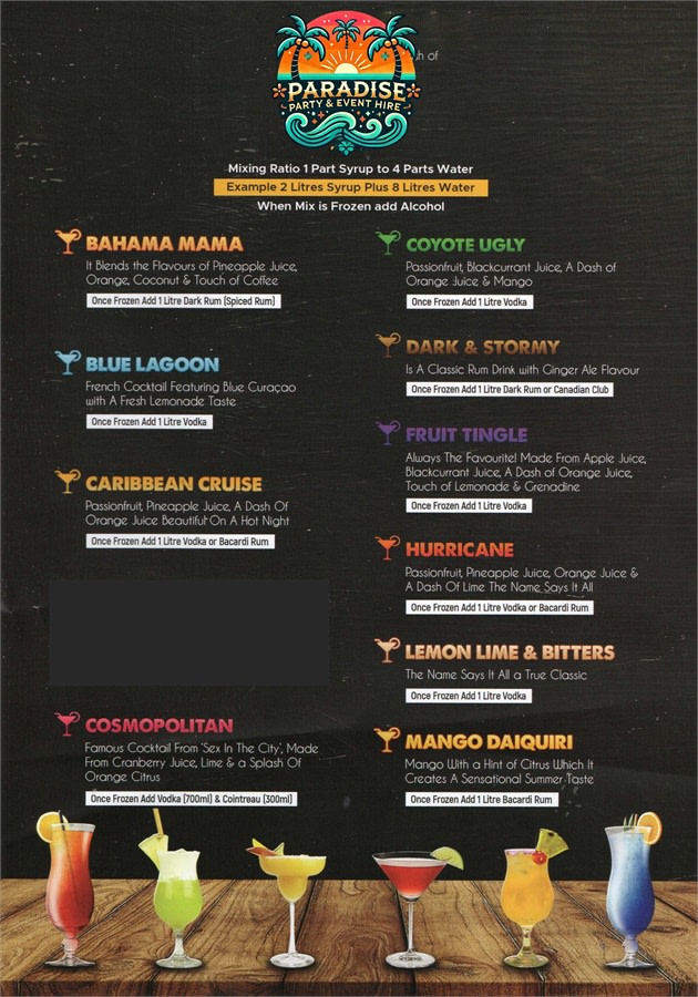 1. Bahama Mama – Once Frozen Add 1 Litre Dark Rum 2. Blue Lagoon – Once Frozen Add 1 Litre Vodka 3. Caribbean Cruise – Once Frozen Add 1 Litre Vodka or Bacardi Rum 4. Cosmopolitan – Once Frozen Add Vodka (700ml) or Cointreau (300ml) 5. Coyote Ugly – Once Frozen Add 1 Litre Vodka 6. Dark & Stormy – Once Frozen Add 1 Litre Dark Rum 7. Fruit Tingle – Once Frozen Add 1 Litre Vodka 8. Hurricane – Once Frozen Add 1 Litre Vodka or Bacardi Rum 9. Lemon Lime & Bitters – Once Frozen Add 1 Litre Vodka 10. Mango Daiquiri – Once Frozen Add 1 Litre Bacardi Rum 11. Margarita – Once Frozen Add 1 Litre Tequila 12. Midori Illusion – Once Frozen Add Midori (300ml) Vodka or Bacardi Rum (700ml) 13. Mojito – Once Frozen Add 1 Litre Bacardi Rum 14. Moscow Mule – Once Frozen Add 1 Litre Vodka 15. Pina Colada – Once Frozen Add 1 Litre Bacardi Rum 16. Pineapple Daiquiri – Once Frozen Add 1 Litre Bacardi Rum 17. Sex on the Beach – Once Frozen Add Vodka (700ml) & Peach Schnapps (300ml) 18. Strawberry Daiquiri – Once Frozen Add 1 Litre Bacardi Rum 19. Tequila Sunrise – Once Frozen Add 1 Litre Tequila 20. Watermelon Daiquiri – Once Frozen Add 1 Litre Bacardi Rum
